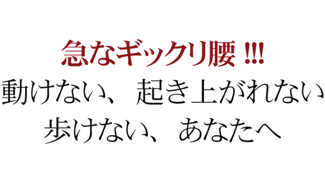 ぎっくり腰は、耐え難い激痛で、歩くのがままならない…、トイレに行くのも辛い…、仕事・家事など、何もできなくなります。