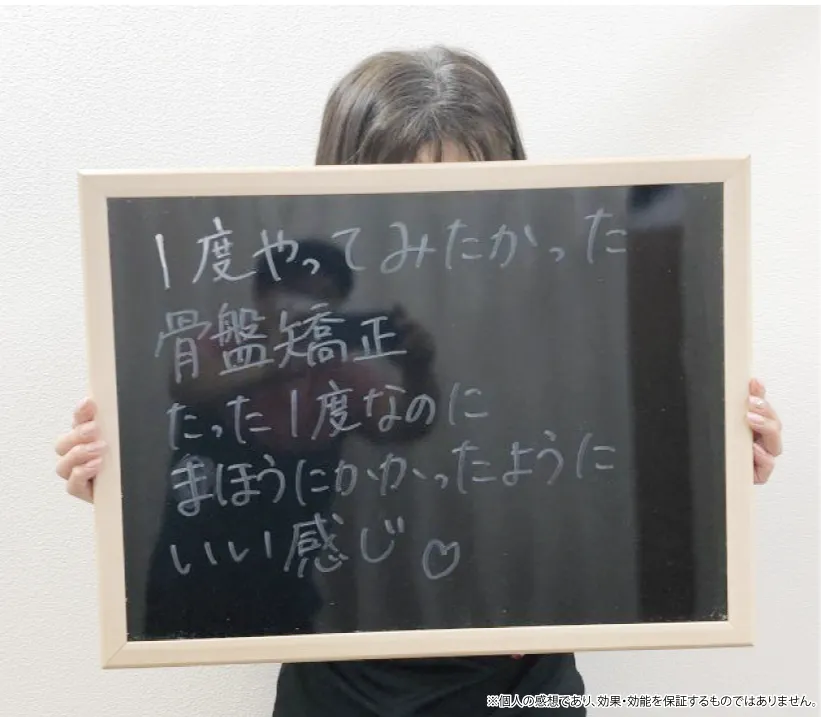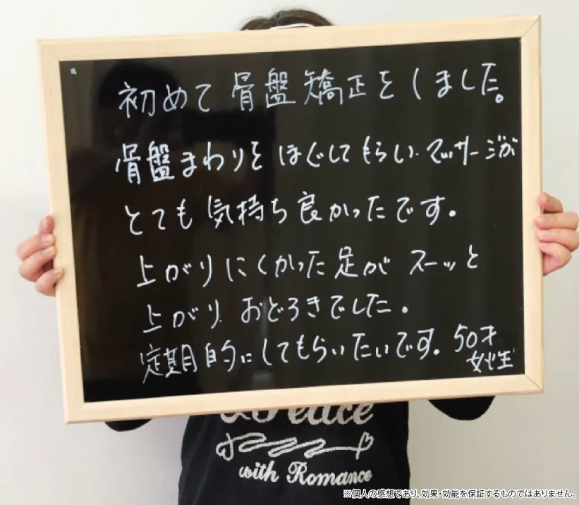 はじめて骨盤矯正をしました。骨盤まわりをほぐしてもらい、マッサージがとても気持ちよかったです。上がりにくかった足が、スーッと上がり驚きでした。