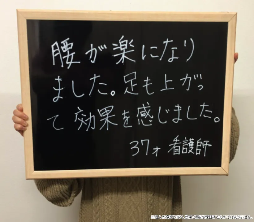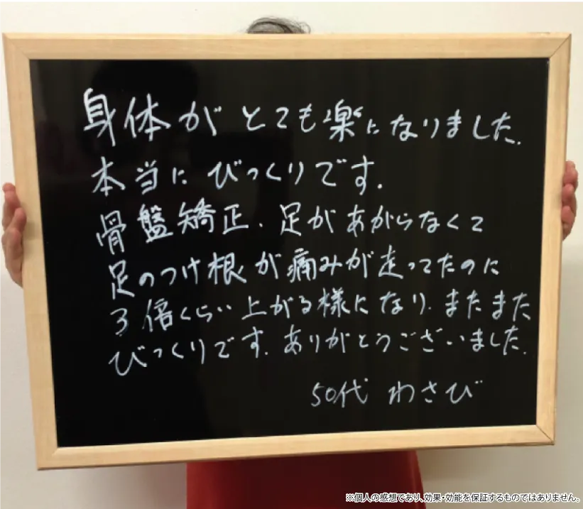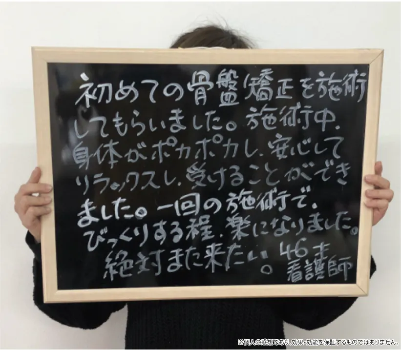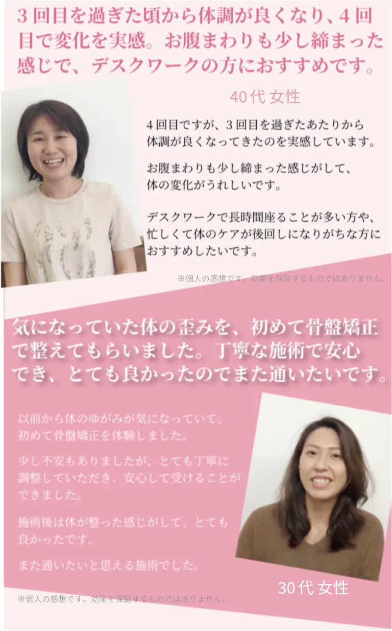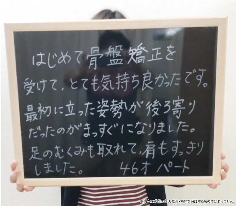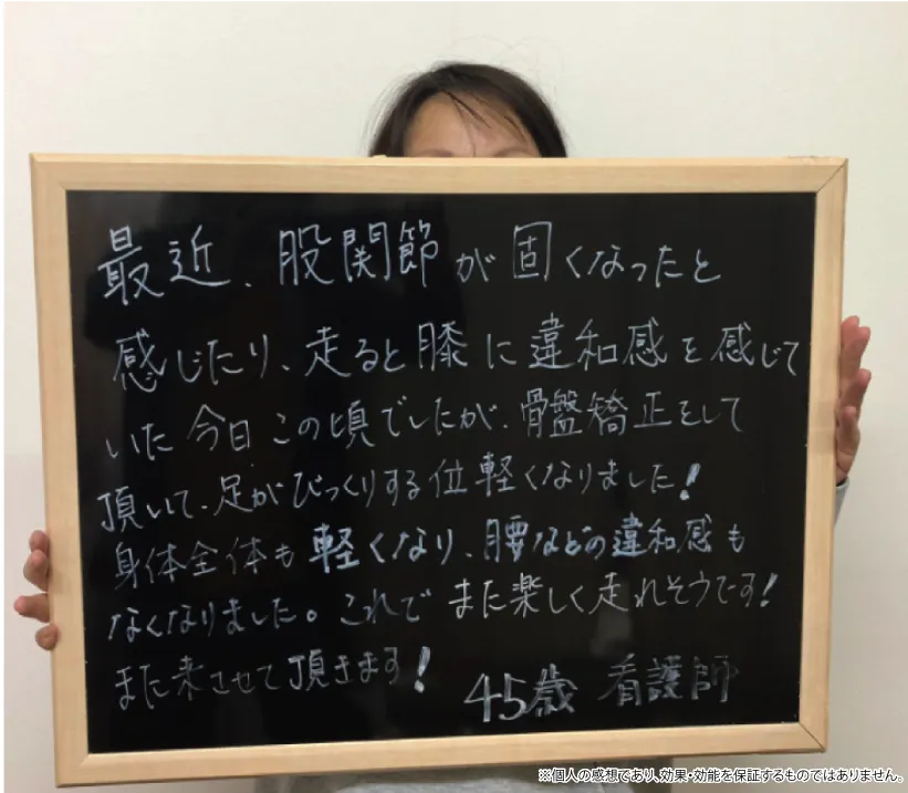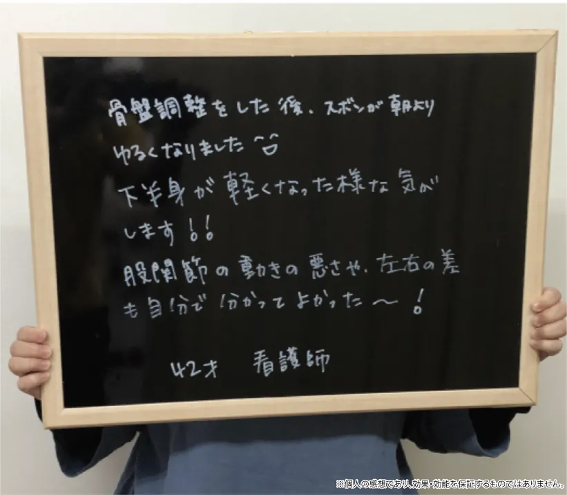 骨盤矯正をした後、ズボンが朝よりゆるくなりました。下半身が軽くなったような気がします。股関節の動きの悪さや、左右の差も自分でわかってよかった。