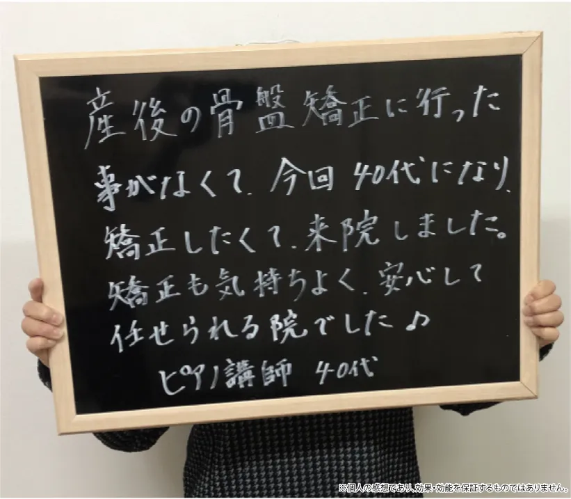 産後の骨盤矯正に行ったことがなくて、今回40代になり矯正をしたくて来院しました。矯正も気持ちよく、安心して任せられる院でした。
