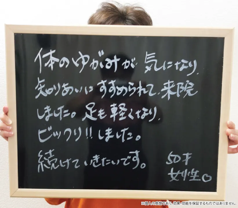 体の歪みが気になり、知り合いにすすめられて来院しました。足も軽くなり、ビックリしました。