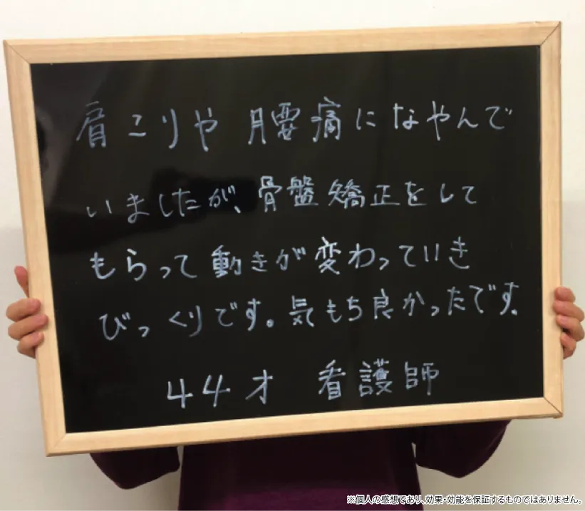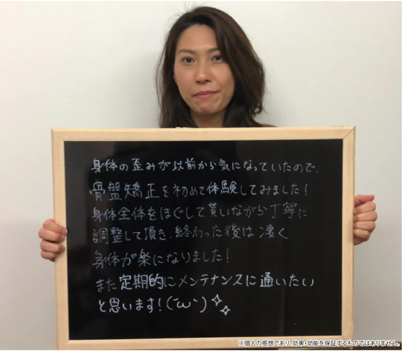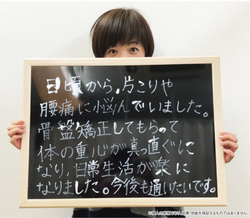肩こりや腰痛に悩んでいましたが、骨盤矯正をしてもらって動きが変わっていき、ビックリです。気持ちよかったです。