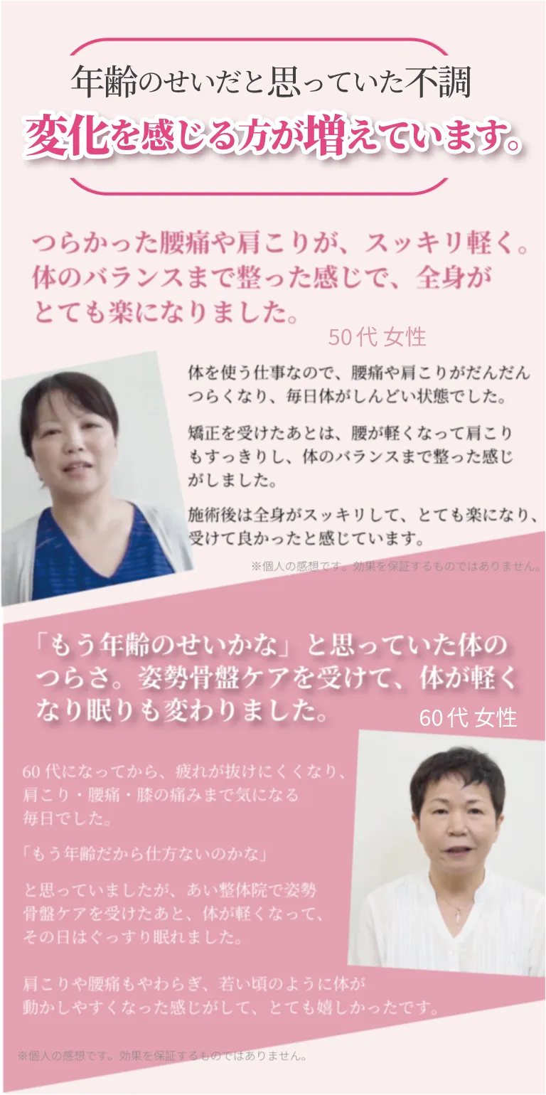 当院の姿勢骨盤ケアには、寝ても取れない疲れ・頭痛・肩こり・腰痛・体型の崩れなど、さまざまなお悩みの方が来られています。