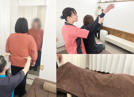 施術後、立ちやすさ、肩や腰の軽さ、足元の安定感などを一緒に確認し、今の不調につながっているポイント・今の姿勢の状態をお伝えします。