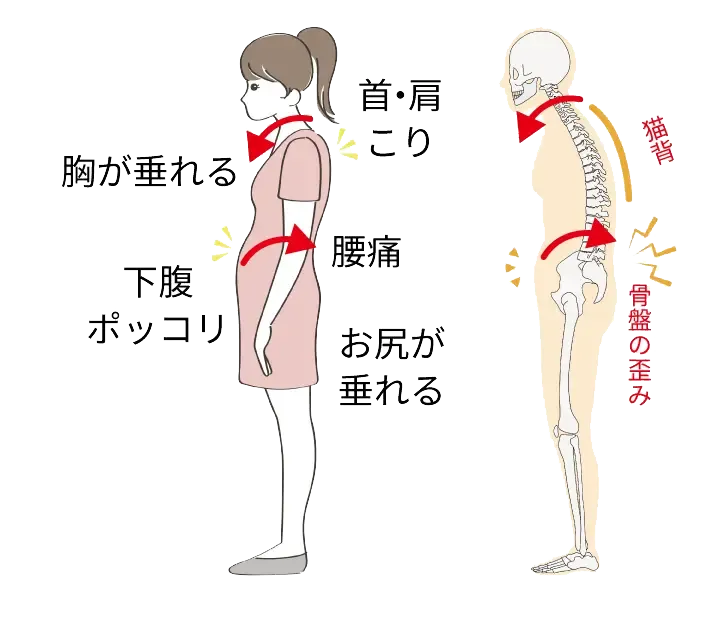 この状態が続くと、肩や腰に負担が集中しやすくなります。