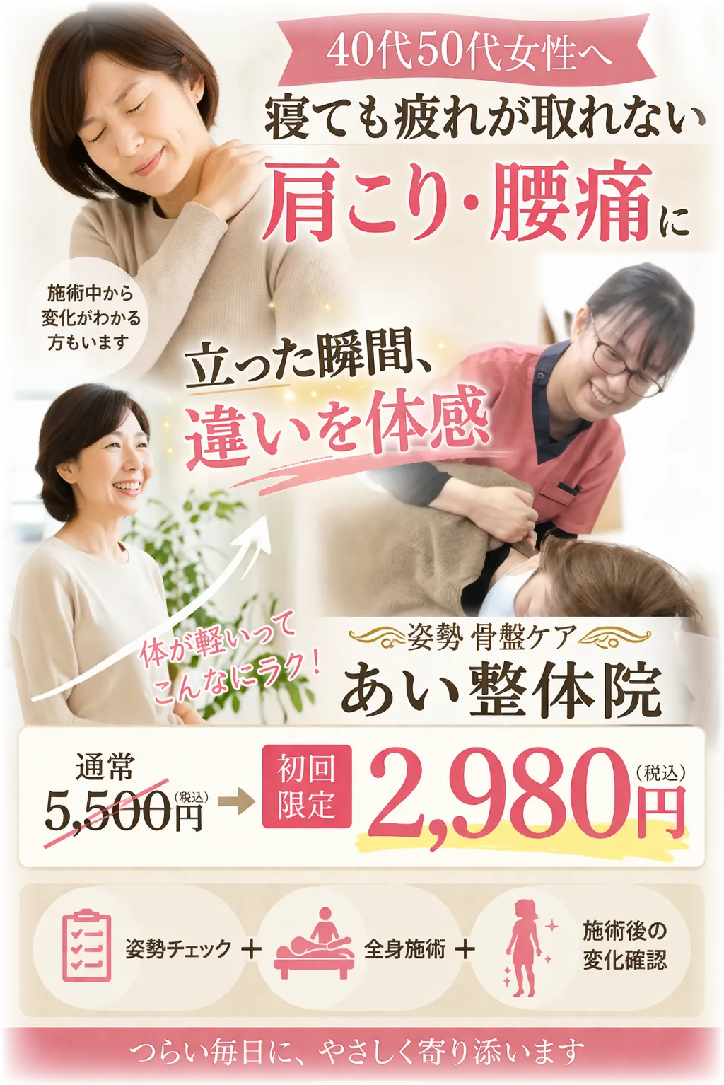 そのつらさは、肩や腰だけの問題ではなく、姿勢・骨盤・立ち方・全身の筋肉のバランス が関係していることがあります。