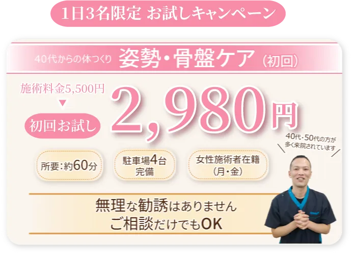 2011年開業以来、姿勢骨盤専門の整体として15年。松山市の多くの方にご利用いただいています。