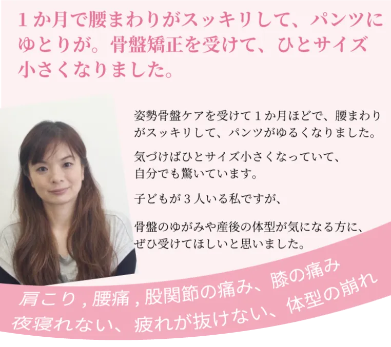 子供が3人いるんですけど、骨盤矯正をはじめて1ヶ月くらいになるのですけど、腰回りがスッキリしてきて、パンツもゆるくなって、1サイズ下がったような感じです。