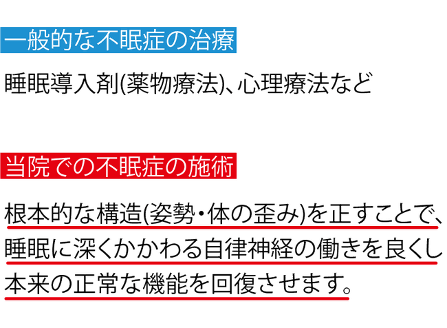 当院では、不眠症の原因は自律神経の乱れと、体の歪みや固さが原因であると考えています。